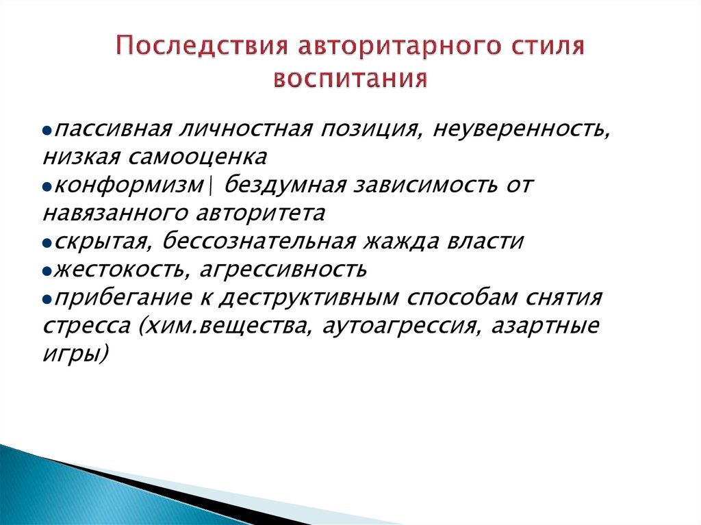 Авторитарный стиль воспитания характеризуется строгими правилами и высокими требованиями. Родители, придерживающиеся этого подхода, часто контролируют каждое действие своего ребенка, что, как правило, приводит к формированию послушного, но не креативного человека; Дети с таким воспитанием могут испытывать трудности в самовыражении и не рискуют думать нестандартно, опасаясь осуждения.